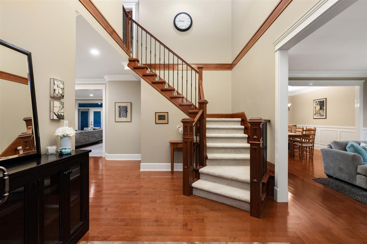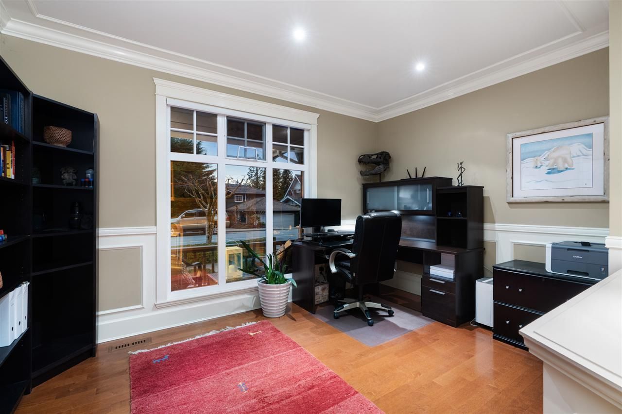 Stunning traditional with 4 spacious bedrooms up, and 3 with ensuites. A grand home beautifully finished with quality and perfectly kept. FLAT property just minutes to EDGEMONT, HANDSWORTH and CLEVELAND. Main floor office, formal living, dining, and open kitchen family-room all looking out to manicured gardens. High ceilings, wood floors, stone counters, custom millwork and upgraded STAINLESS STEEL appliances make this one a stand-out. Totally private, treed backdrop and lots of sun, make this one-of-a-kind EXECUTIVE home the perfect package. Lower level has rec-room, a great living space, 2 full baths, a few bedrooms, and is roughed in for a suite. Perfect for the growing or extended family, and incomparable value. All this, and an over-sized setting, don't miss it! Great STUDIO too!