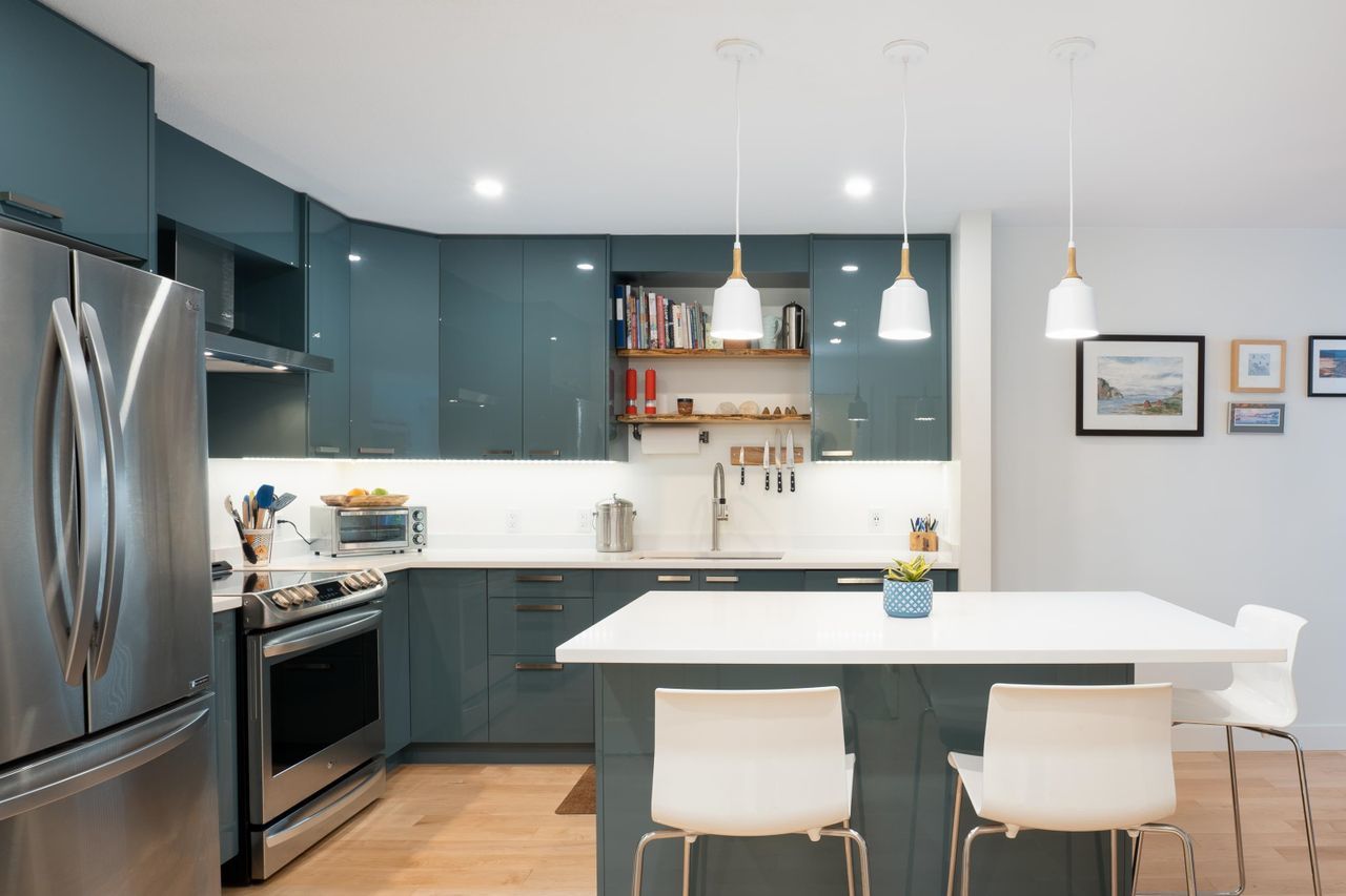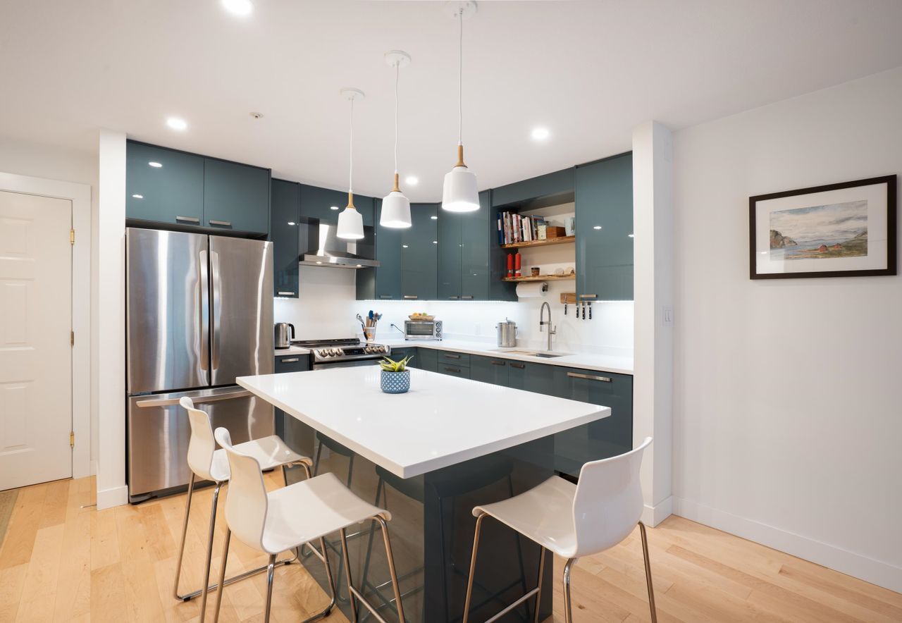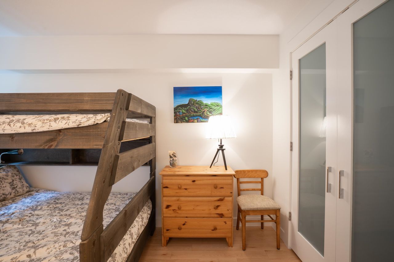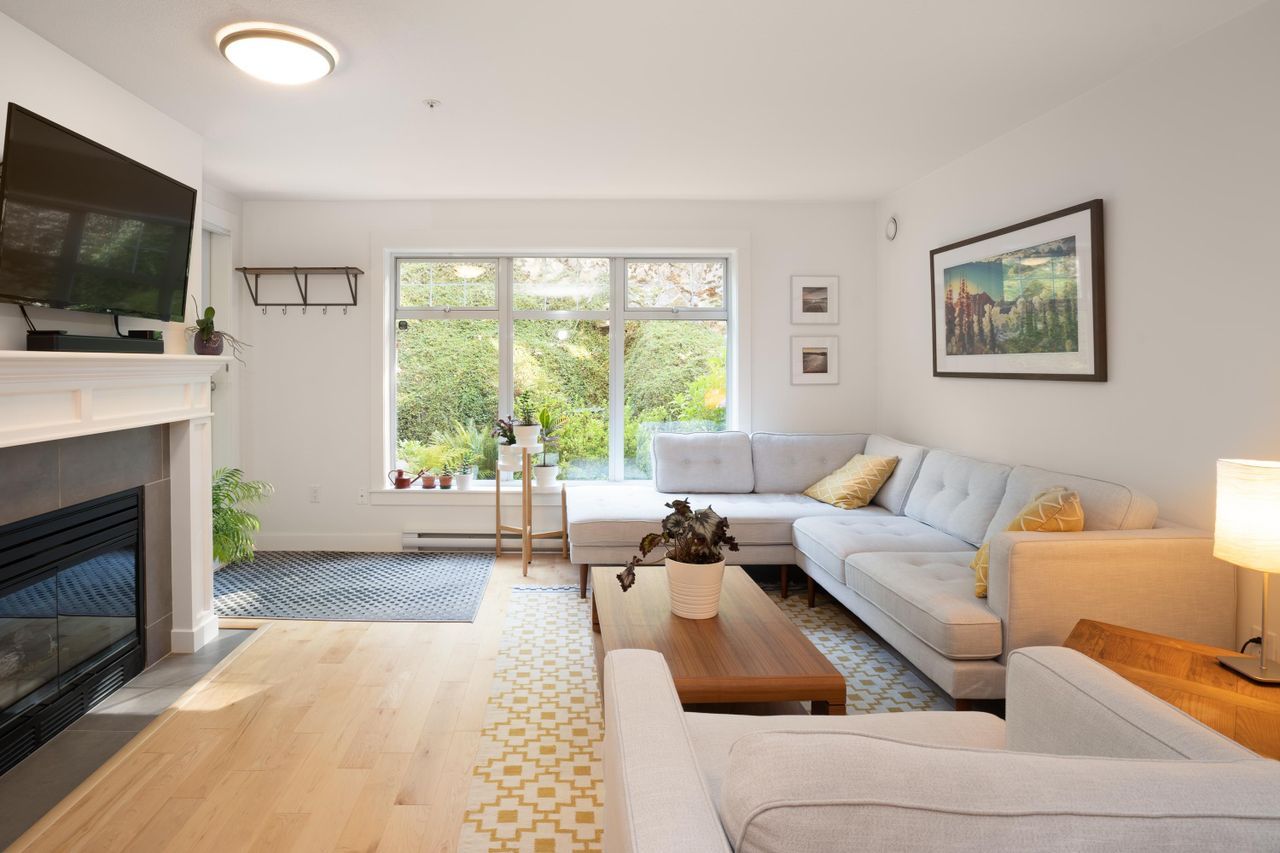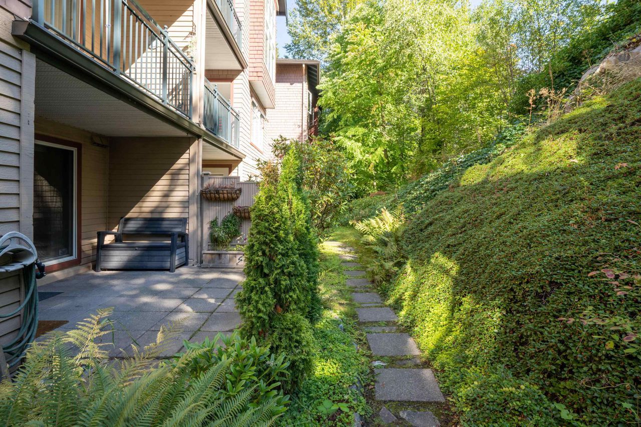 Condo living with the conveniences of a single-family home! Ride your bike or walk out the back patio door of this beautiful, two-bedroom, ground-level home. This peaceful location gives maximum privacy and provides quick access to trails, shopping and public transit. Storage in this unit is a breeze with an oversized storage locker just next door on the same floor. If you're looking for a stylish and trendy space - this unit will impress. A lovely top-to-bottom, quality renovation in a well-cared-for building with manicured grounds and a proactive strata. This home includes in-suite laundry, hardwood floors, heated floors in the bathrooms and a great layout at 1076/sf. Pets allowed/Rentals not allowed/1 Parking/1 Storage.